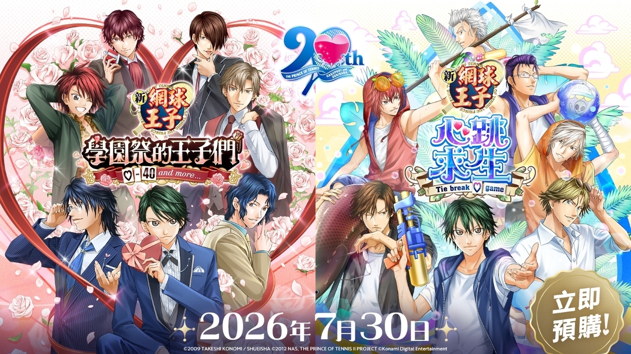 描述: Konami Digital Entertainment Limited(KONAMI)今日宣布,改編自《網球王子》的戀愛冒險遊戲《網球王子 學園祭的王子們 ♡-40 and more...》(以下簡稱《學園祭的王子們》)及《網球王子 心跳求生 Tie break ♡ game》(以下簡稱《心跳求生》),兩款遊戲的 Remastered 重製版將同步於 7 月 30 日(四)發售,遊戲內對應繁體中文,現已開放預購。 《學園祭